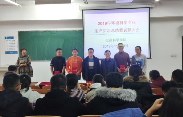 2019年11月10日下午,beat365在线体育在科技楼323教室召开了2019年度环境科学专业生产实习总结暨表彰大会。副经理高明华、副书记张玉桩、环境科学系主任徐春光、实习指导教师黄学文、特喜铁和李杰、2016级环境科学班和2016级环境科学蒙班全体同学参加了大会。会议由环境科学系主任徐春光主持。